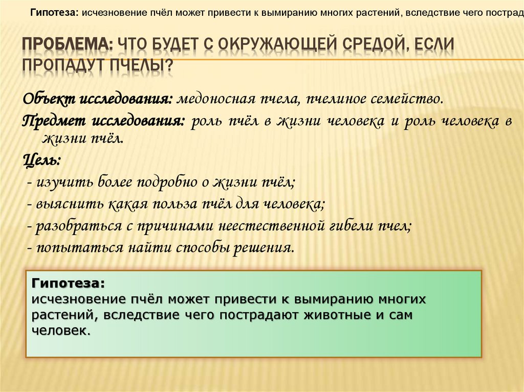 Гипотеза: исчезновение пчёл может привести к вымиранию многих растений, вследствие чего пострадаПРОБЛЕМА: ЧТО БУДЕТ С ОКРУЖАЮЩЕЙ СРЕДОЙ, ЕСЛИ
