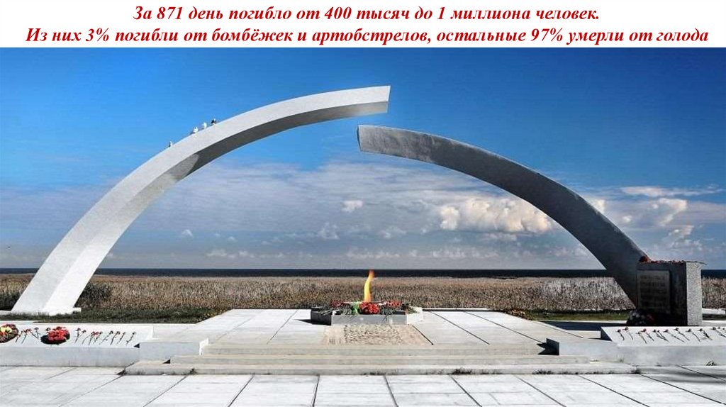 За 871 день погибло от 400 тысяч до 1 миллиона человек.Из них 3% погибли от бомбёжек и артобстрелов, остальные 97% умерли от голода