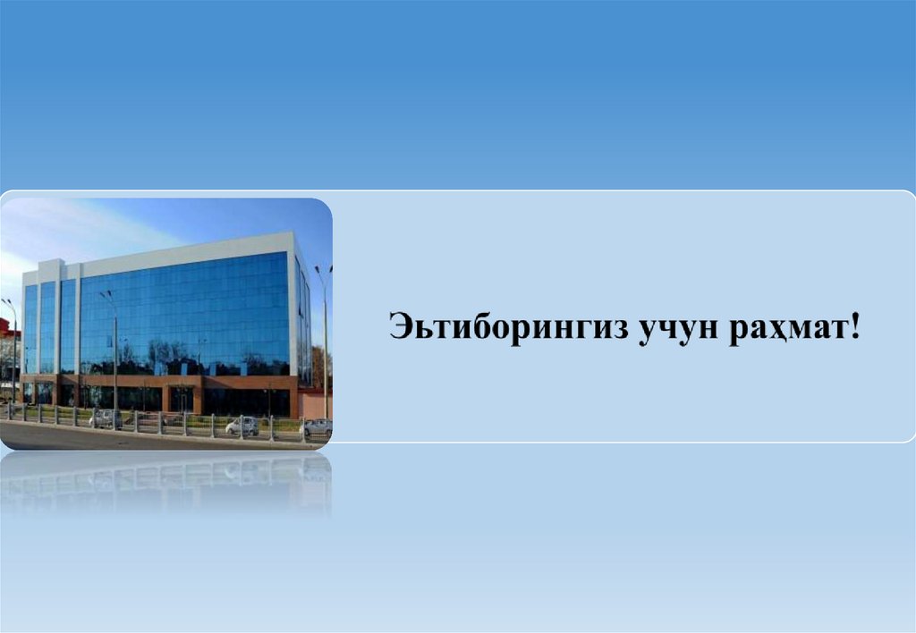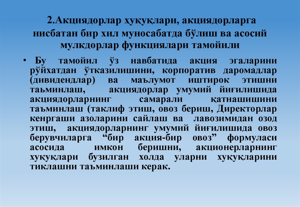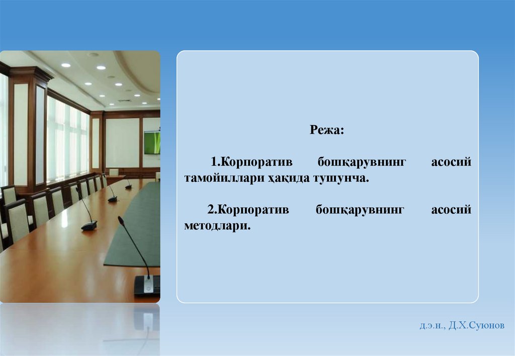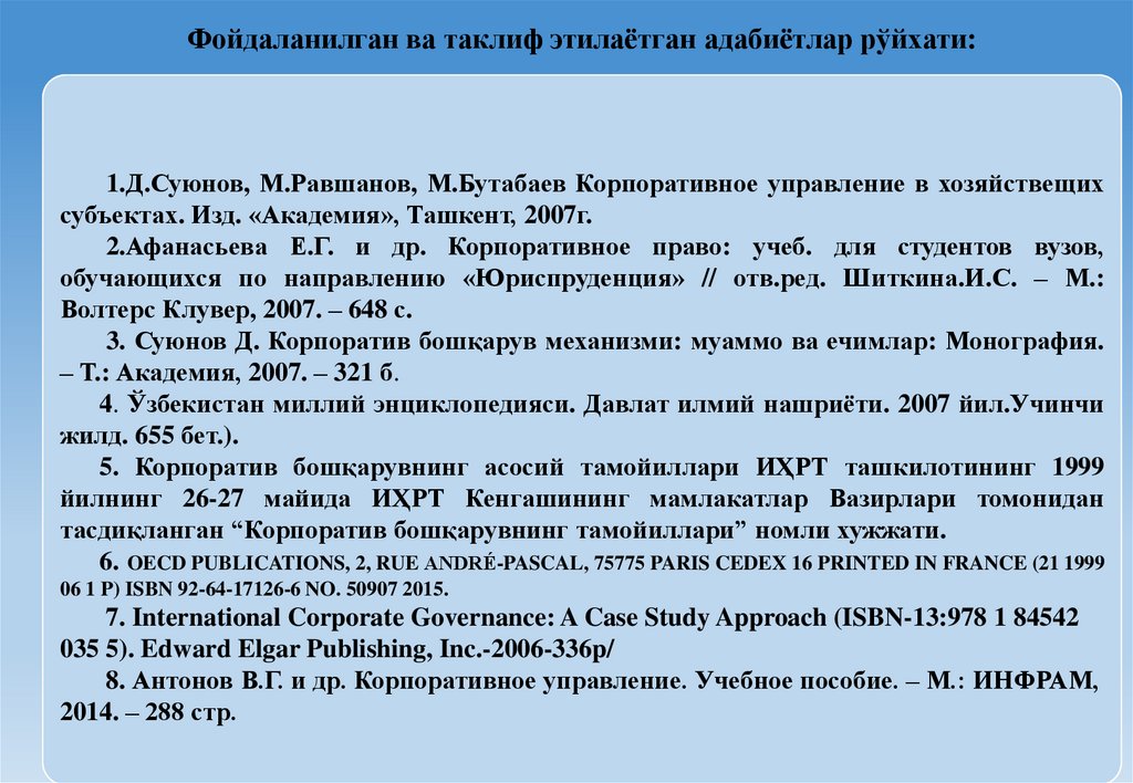 Фойдаланилган ва таклиф этилаётган адабиётлар рўйхати:1.Д.Суюнов, М.Равшанов, М.Бутабаев Корпоративное управление в хозяйствещих