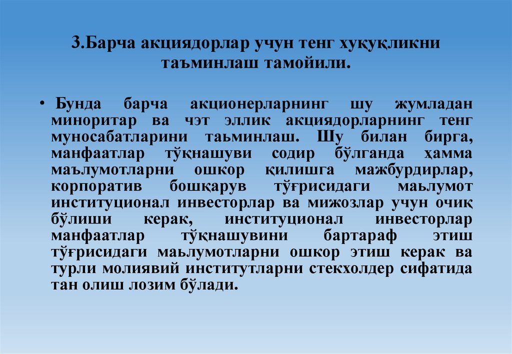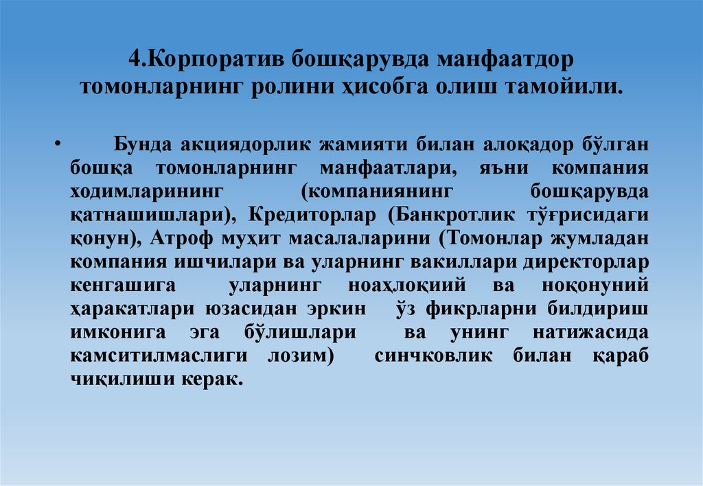 4.Корпоратив бошқарувда манфаатдортомонларнинг ролини ҳисобга олиш тамойили.