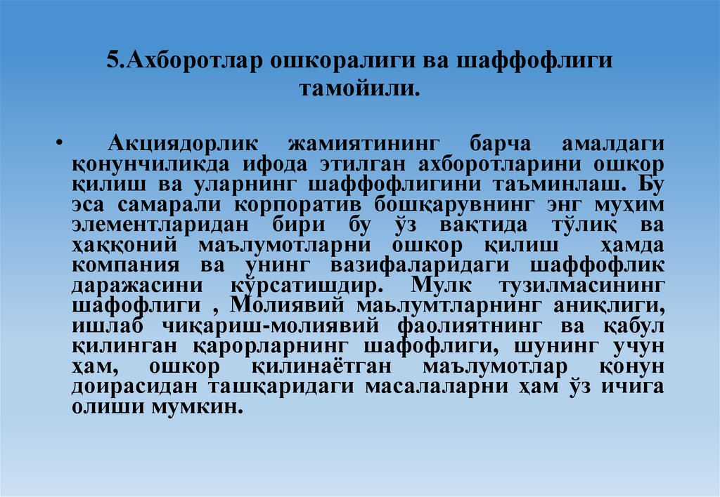 5.Ахборотлар ошкоралиги ва шаффофлигитамойили.