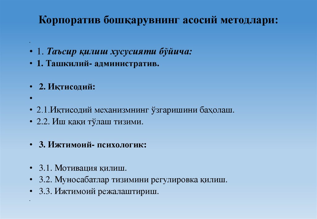 Корпоратив бошқарувнинг асосий методлари:• 1. Таъсир қилиш хусусияти бўйича: