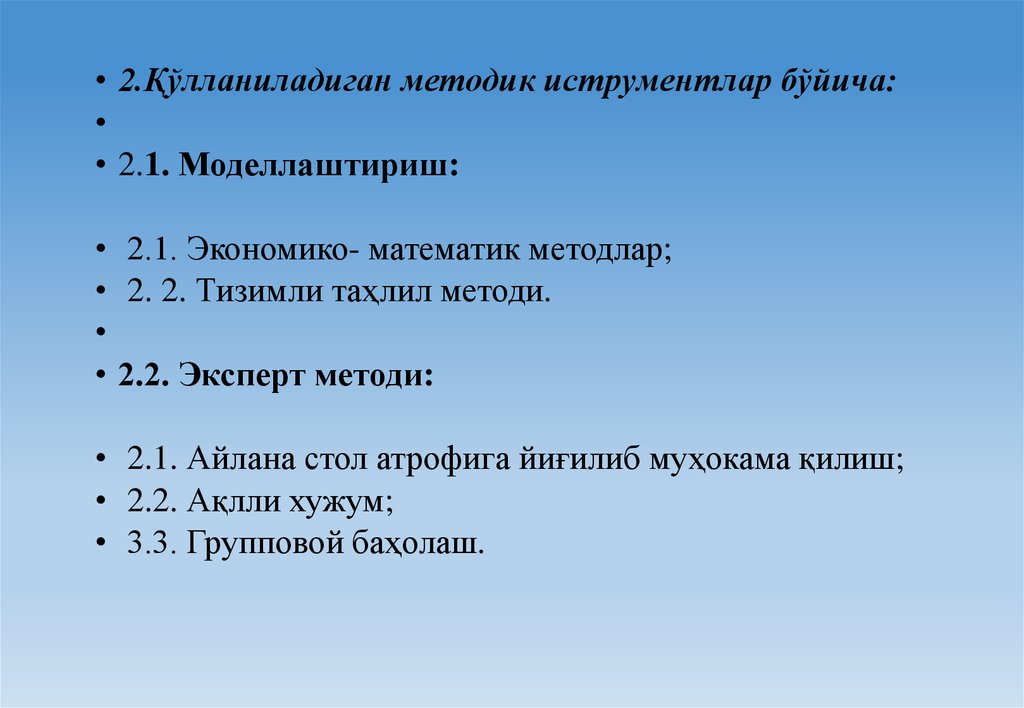 • 2.Қўлланиладиган методик иструментлар бўйича:• 2.1. Моделлаштириш: