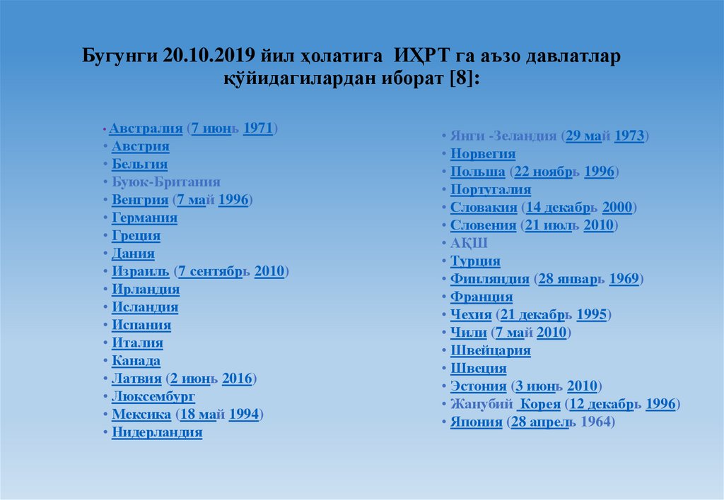 Бугунги 20.10.2019 йил ҳолатига ИҲРТ га аъзо давлатларқўйидагилардан иборат [8]: