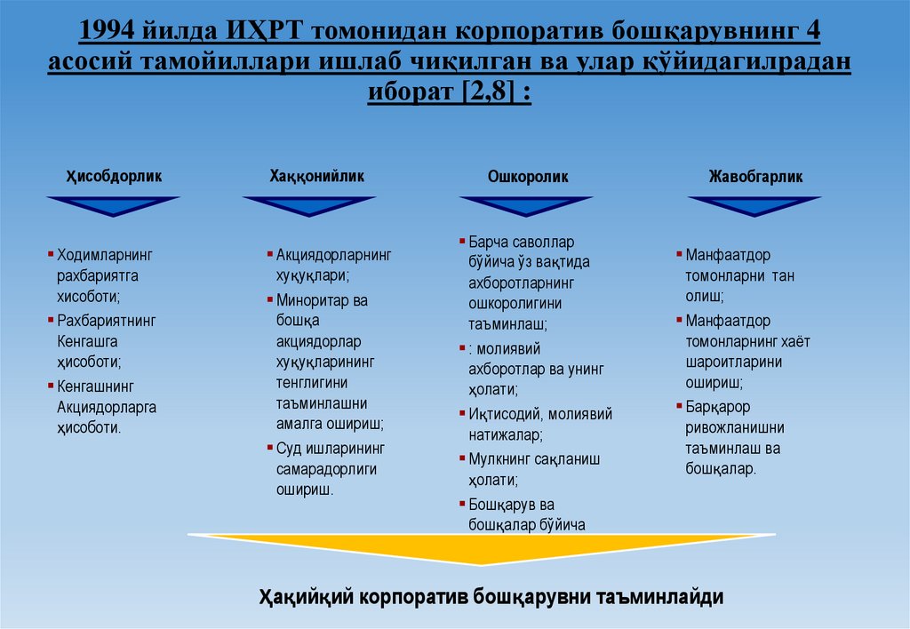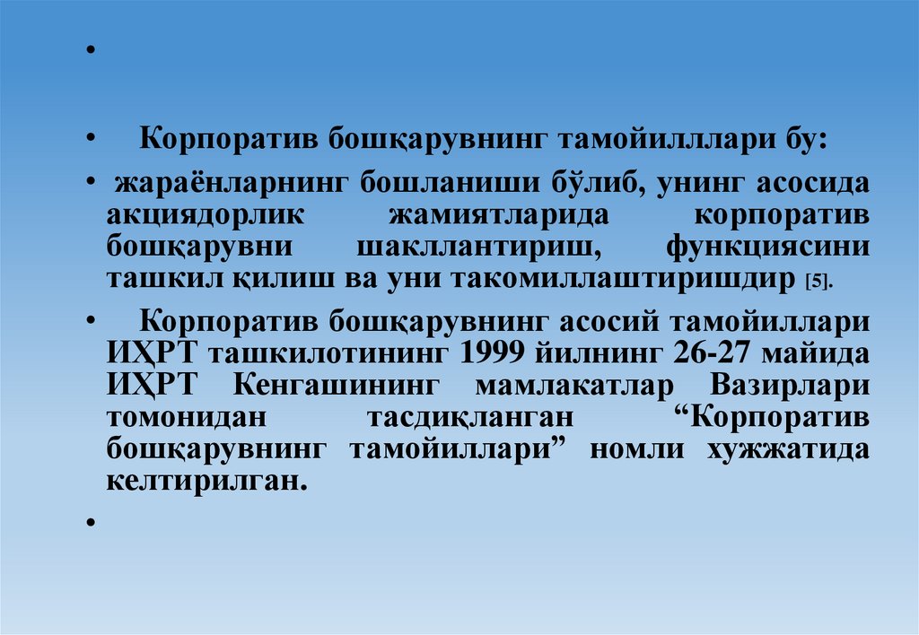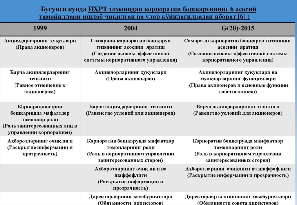 5. Корпоратив бошқарувнинг асосий тамойиллари ИҲРТ ташкилотининг 1999