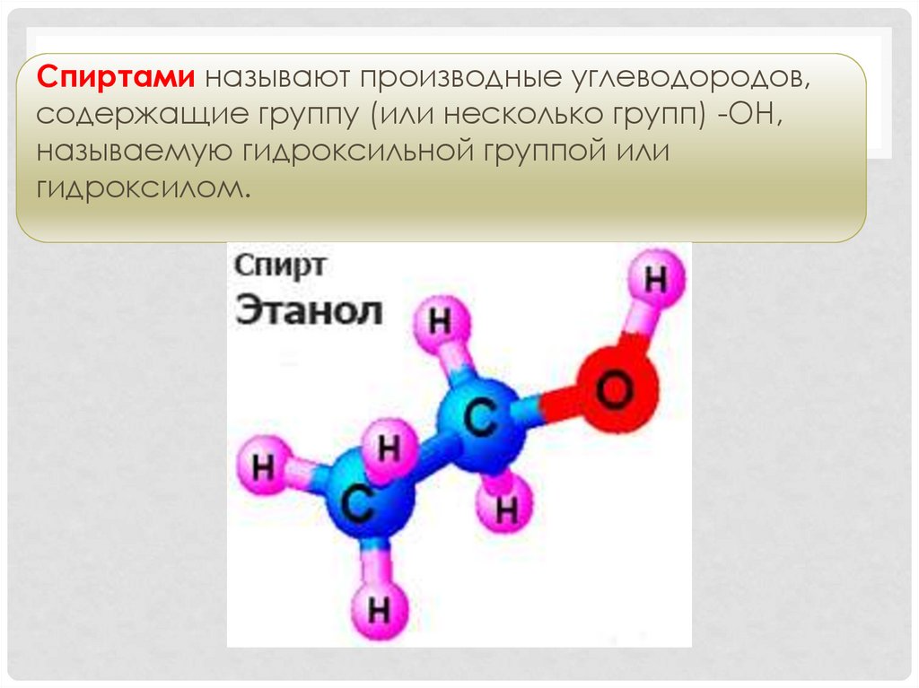 Спиртами называют производные углеводородов,содержащие группу (или несколько групп) -ОН,