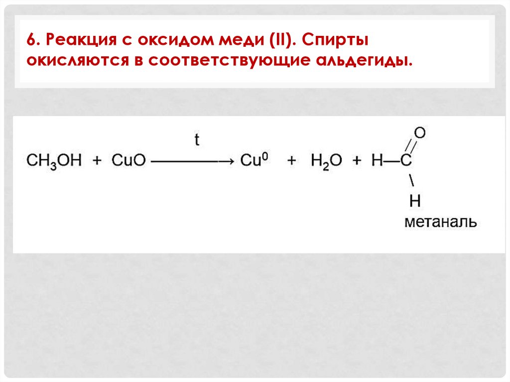 6. Реакция с оксидом меди (II). Спиртыокисляются в соответствующие альдегиды.