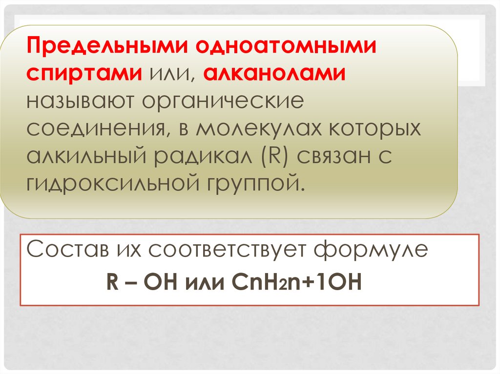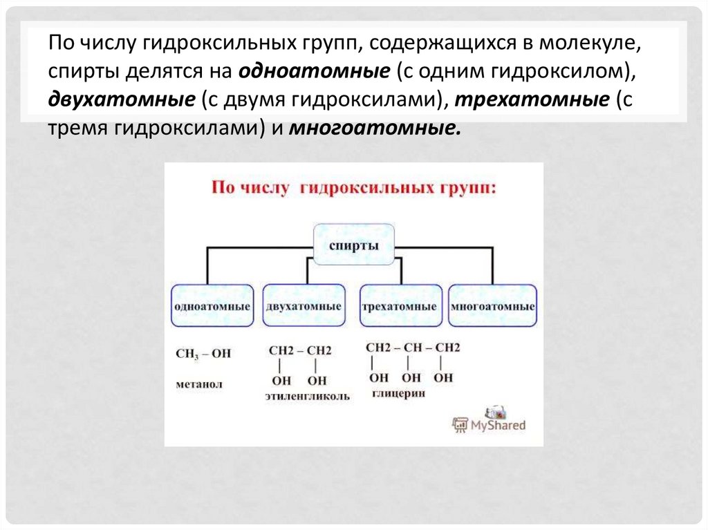 По числу гидроксильных групп, содержащихся в молекуле,спирты делятся на одноатомные (с одним гидроксилом),