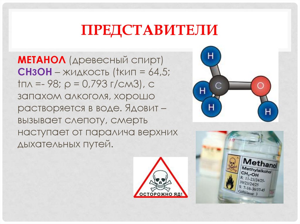 МЕТАНОЛ (древесный спирт)СН3ОН – жидкость (tкип = 64,5;