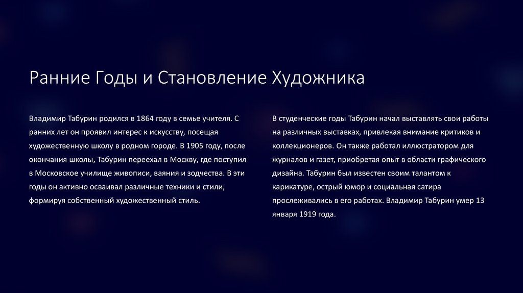 Ранние Годы и Становление ХудожникаВладимир Табурин родился в 1864 году в семье учителя. С
