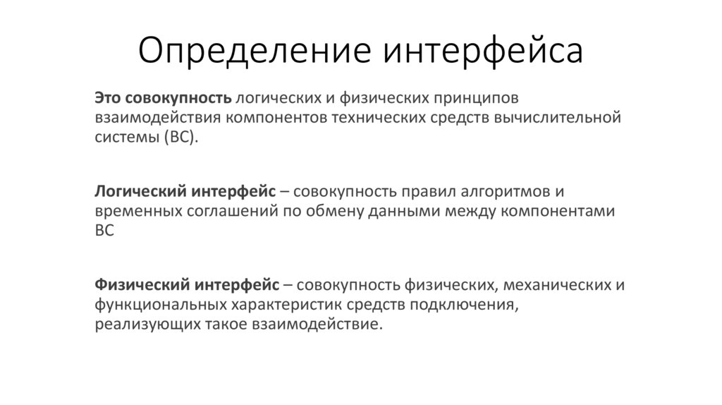 Определение интерфейсаЭто совокупность логических и физических принципов