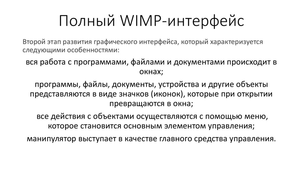 Полный WIMP-интерфейсВторой этап развития графического интерфейса, который характеризуется