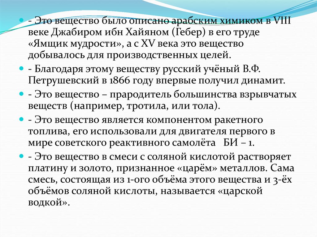 - Это вещество было описано арабским химиком в VIIIвеке Джабиром ибн Хайяном (Гебер) в его труде