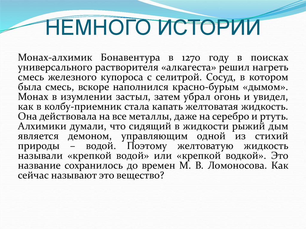 Монах-алхимик Бонавентура в 1270 году в поискахуниверсального растворителя «алкагеста» решил нагреть