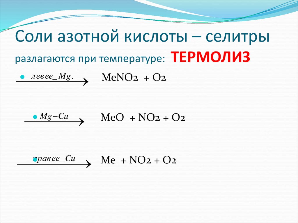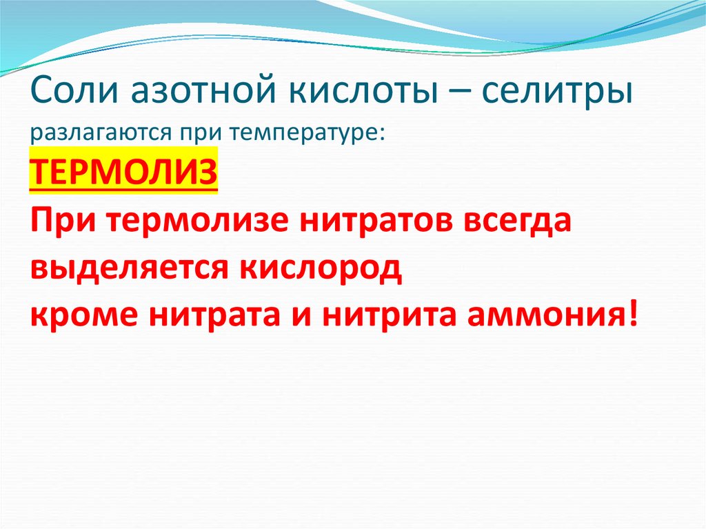 нитрата и нитрита аммония!13. Cоли азотной кислоты – селитры разлагаются при температуре: ТЕРМОЛИЗ