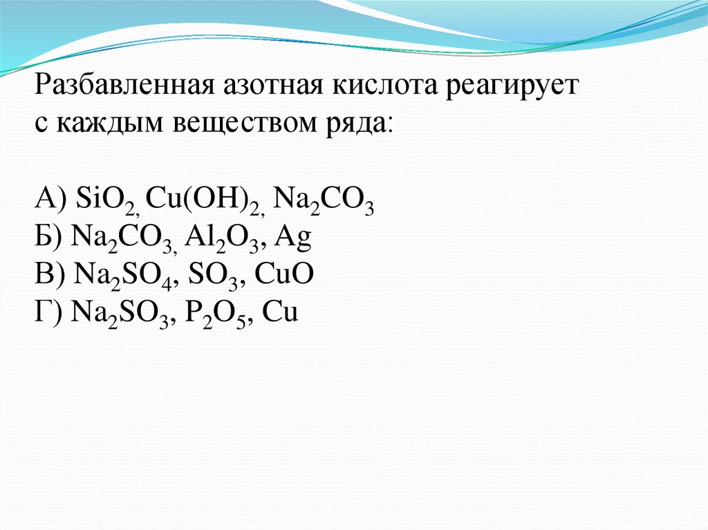 17. Разбавленная азотная кислота реагирует с каждым веществом ряда: А) SiO2, Cu(OH)2, Na2CO3 Б) Na2CO3, Al2O3, Ag В) Na2SO4, SO3,