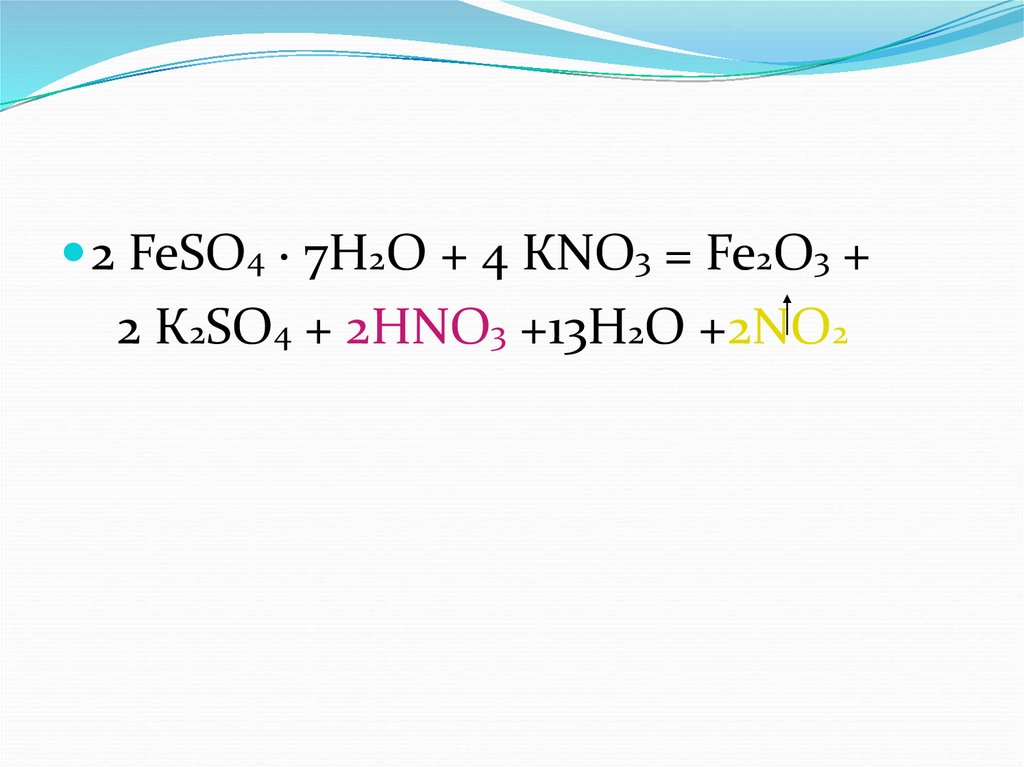 2 FeSO4 · 7Н2О + 4 КNO3 = Fe2О3 +2 К2SO4 + 2НNO3 +13Н2О +2NO2