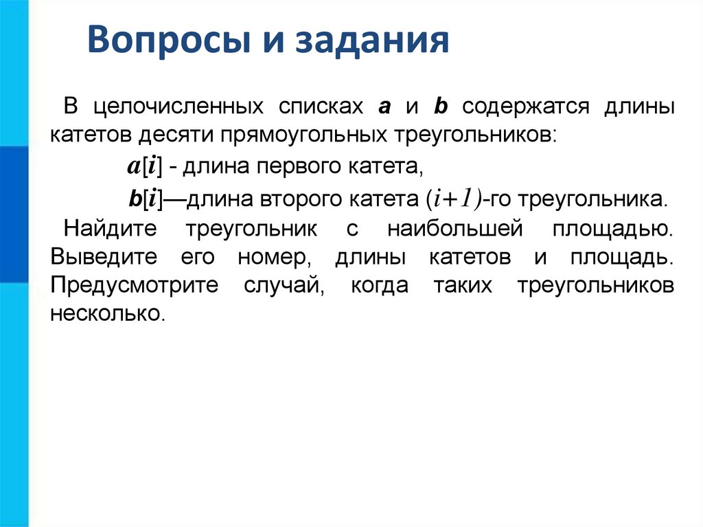 Вопросы и заданияВ целочисленных списках a и b содержатся длины