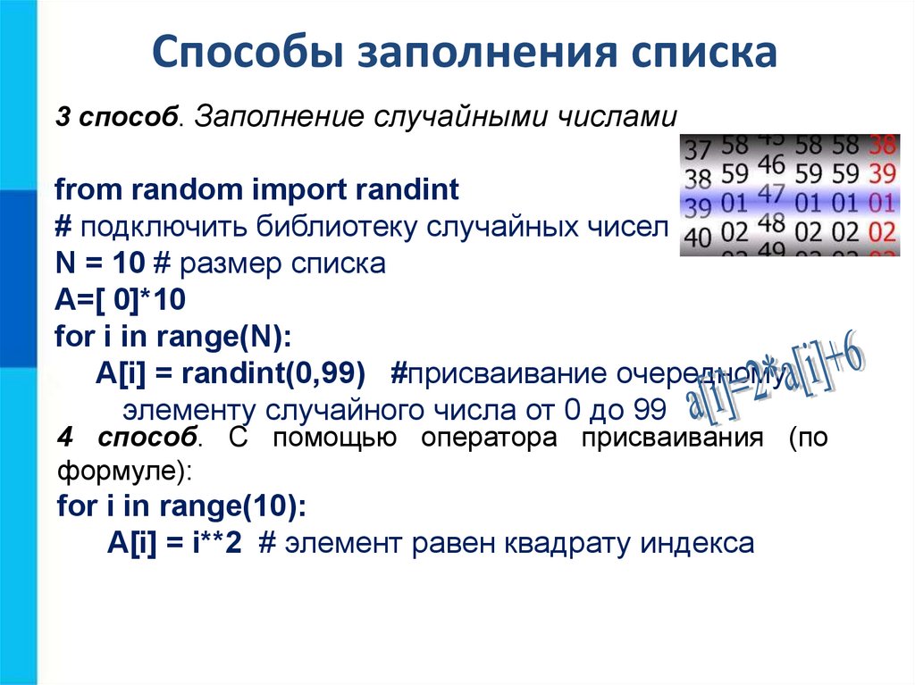 Способы заполнения списка3 способ. Заполнение случайными числами