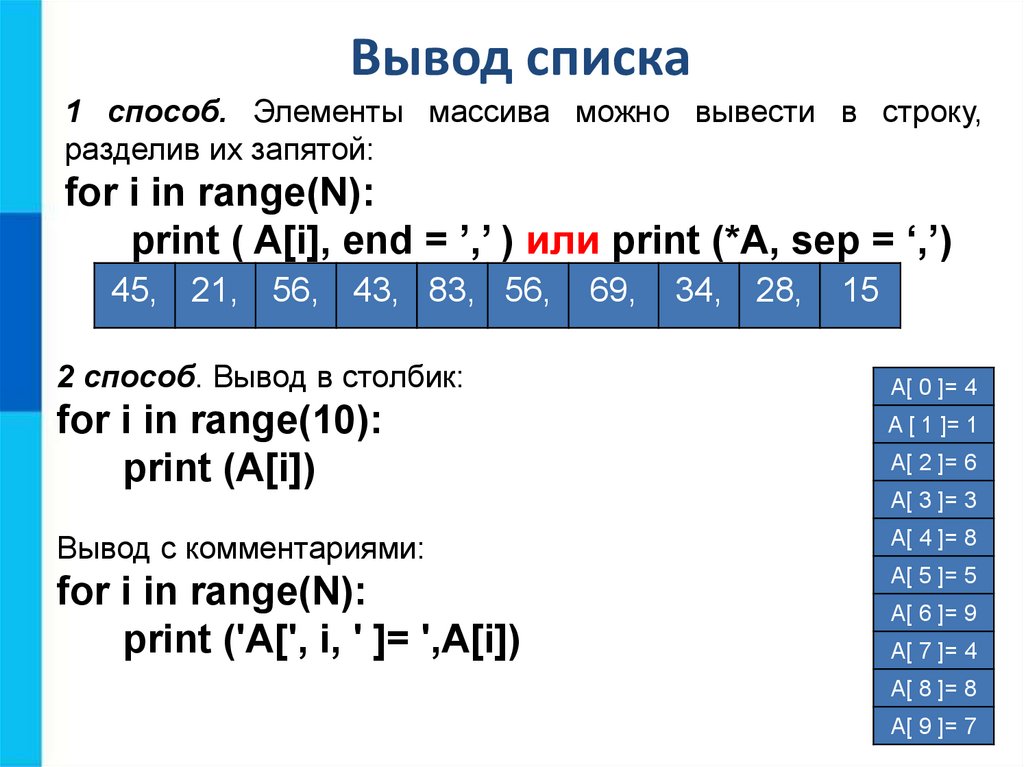 print ( A[i], end = ’,’ ) или print (*A, sep = ‘,’)