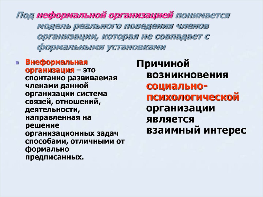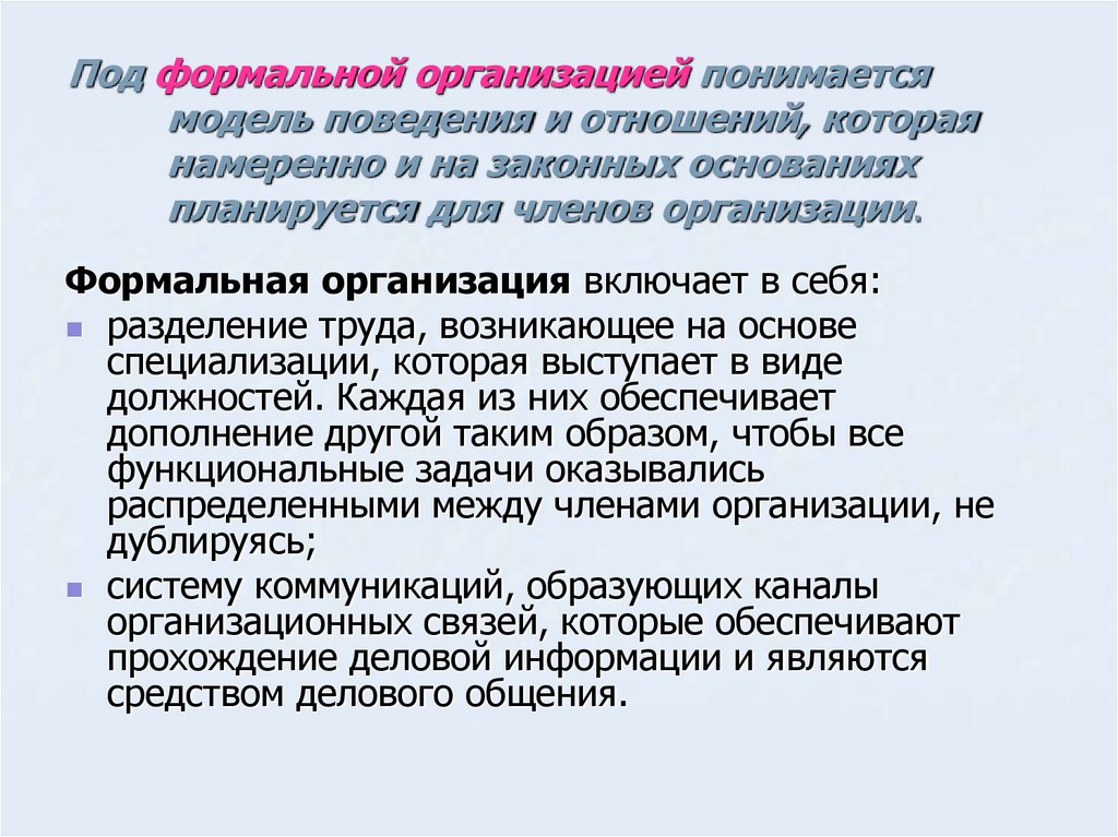 5. Под формальной организацией понимается модель поведения и отношений, которая намеренно и на законных основаниях планируется для