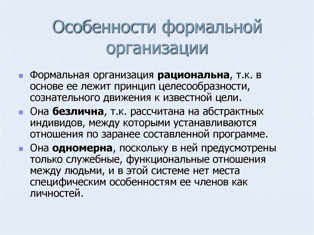 Формальная организация рациональна, т.к. воснове ее лежит принцип целесообразности,