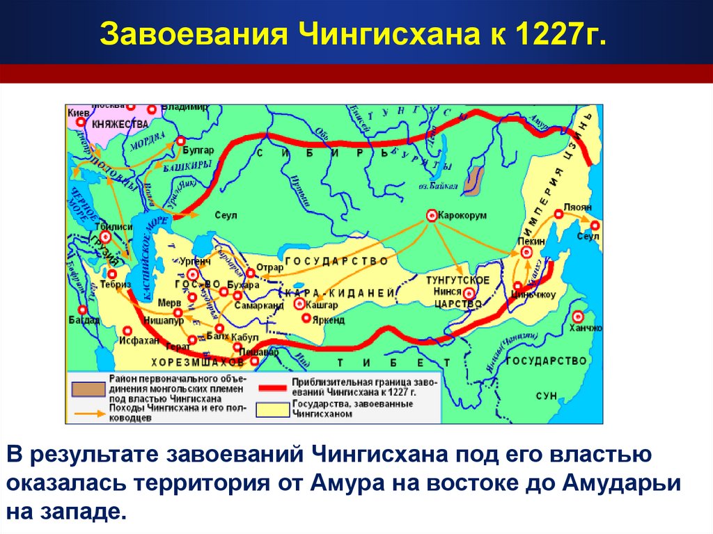 Завоевания Чингисхана к 1227г.В результате завоеваний Чингисхана под его властью