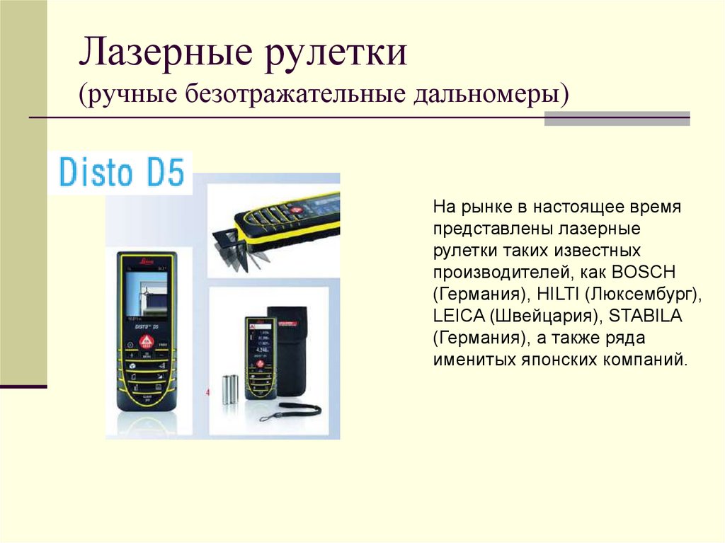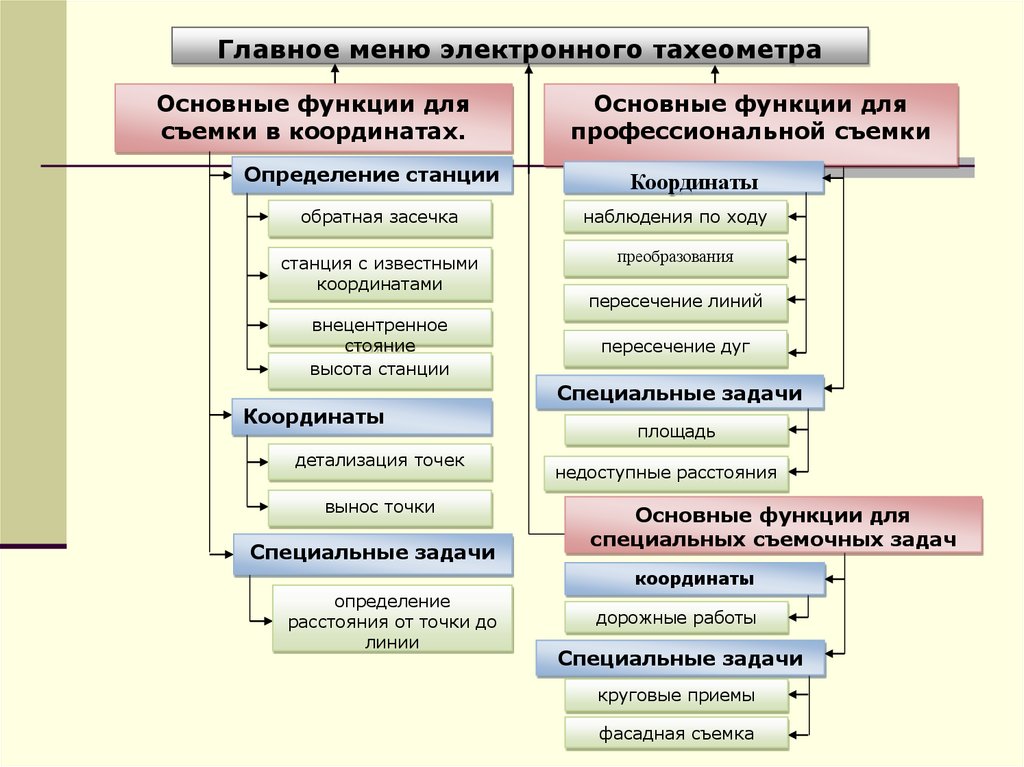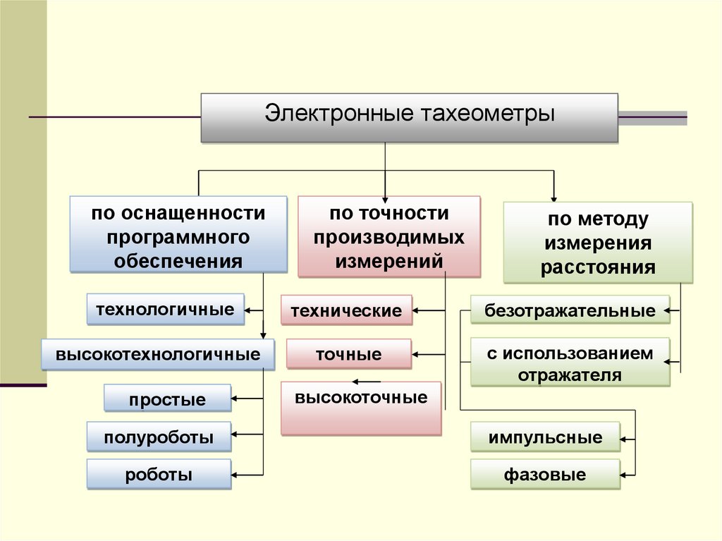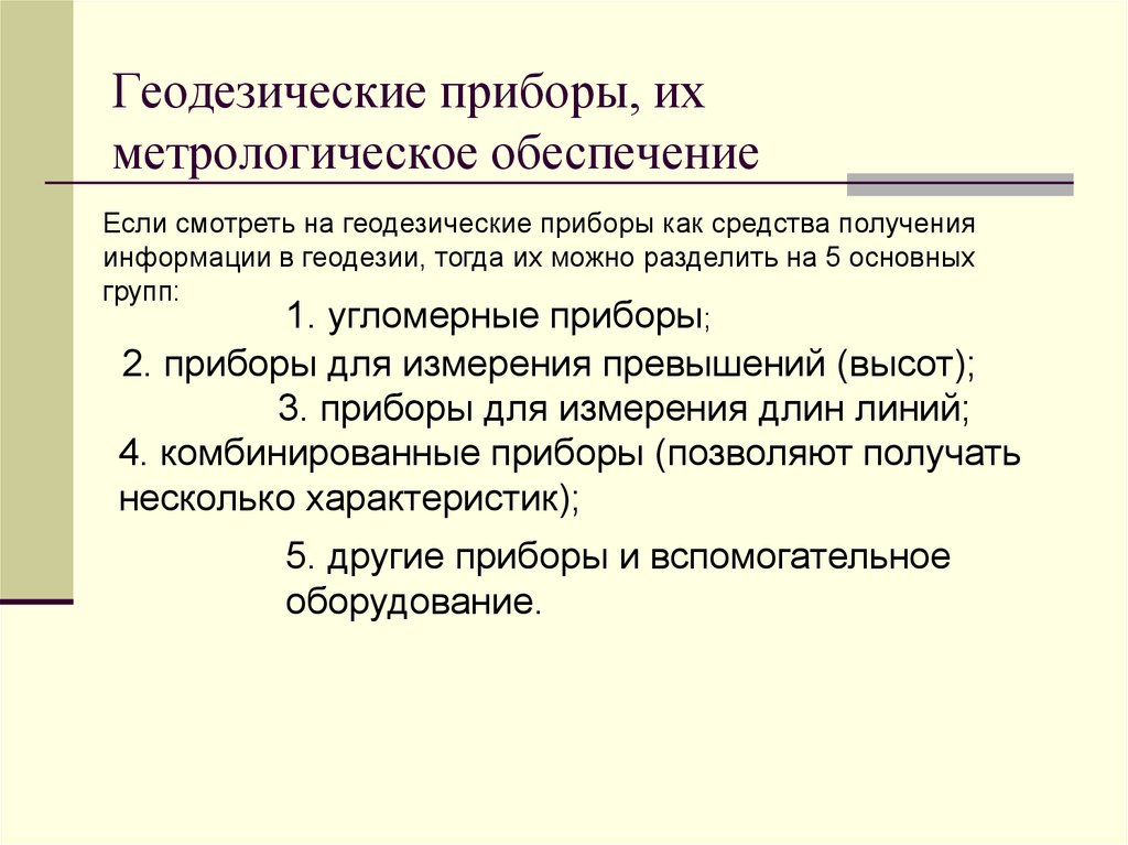 Если смотреть на геодезические приборы как средства полученияинформации в геодезии, тогда их можно разделить на 5 основных