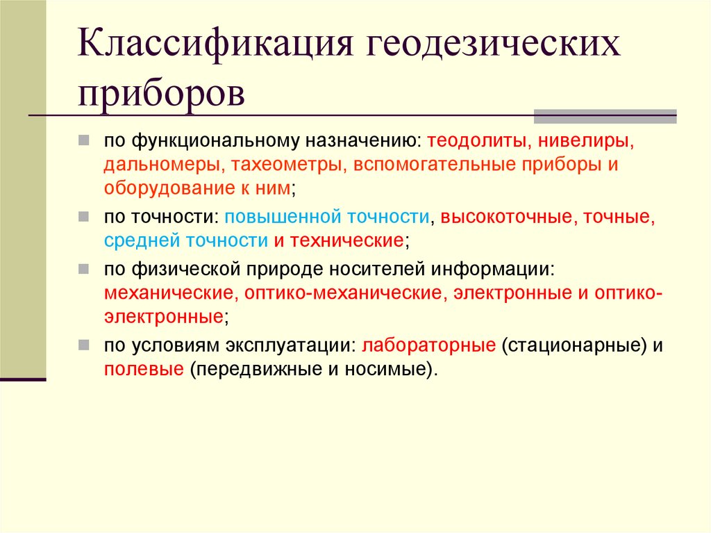 по функциональному назначению: теодолиты, нивелиры,дальномеры, тахеометры, вспомогательные приборы и
