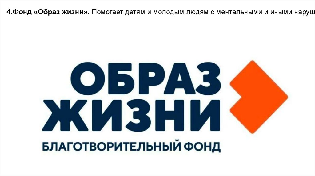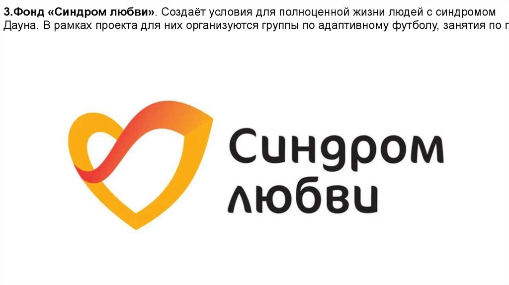 3.Фонд «Синдром любви». Создаёт условия для полноценной жизни людей с синдромомДауна. В рамках проекта для них организуются группы по адаптивному футболу, занятия по п