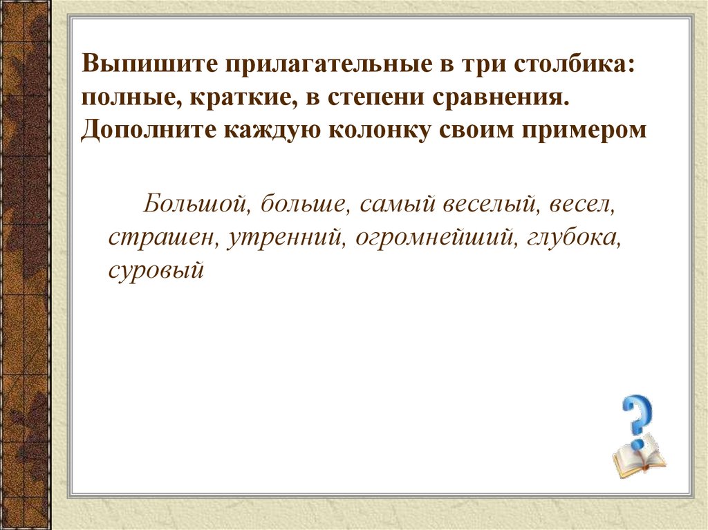 18. Выпишите прилагательные в три столбика: полные, краткие, в степени сравнения. Дополните каждую колонку своим примером