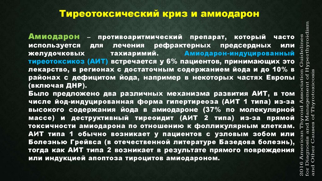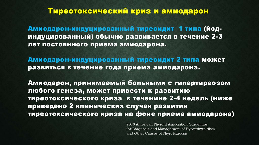 Тиреотоксический криз и амиодаронАмиодарон-индуцированный тиреоидит 1 типа (йодиндуцированный) обычно развивается в течение 2-3
