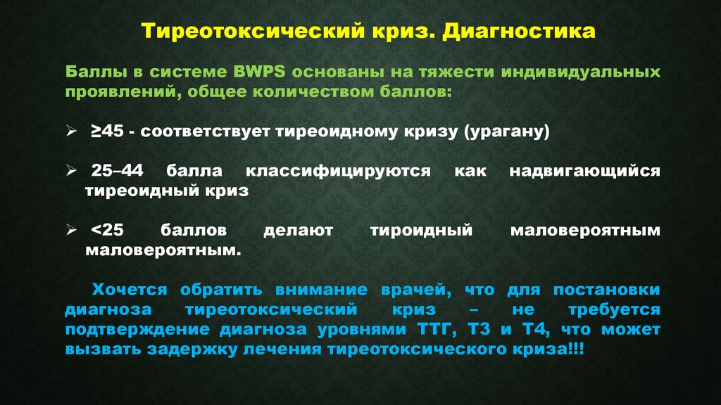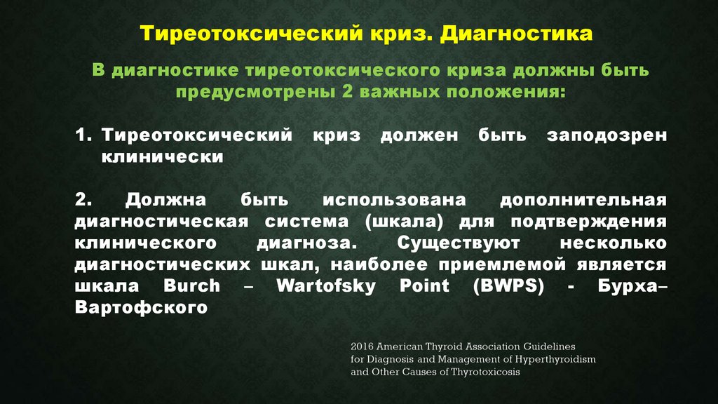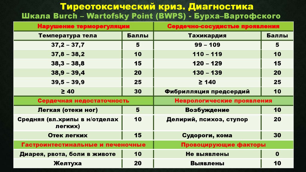 Тиреотоксический криз. ДиагностикаШкала Burch – Wartofsky Point (BWPS) - Бурха–Вартофского