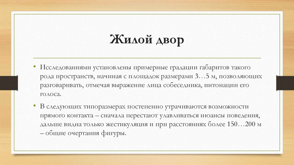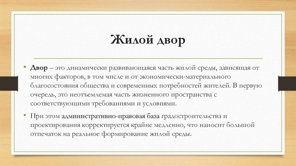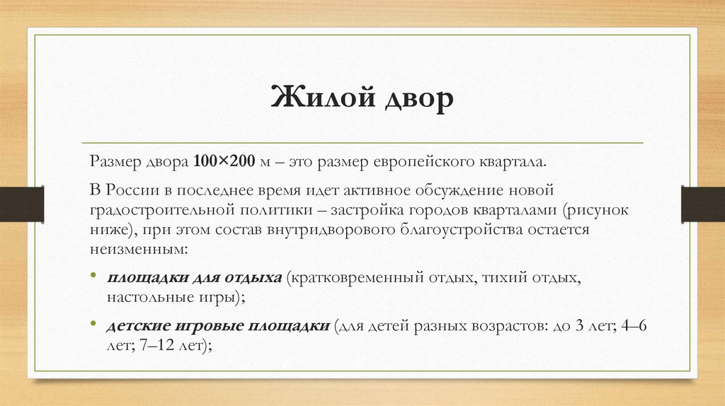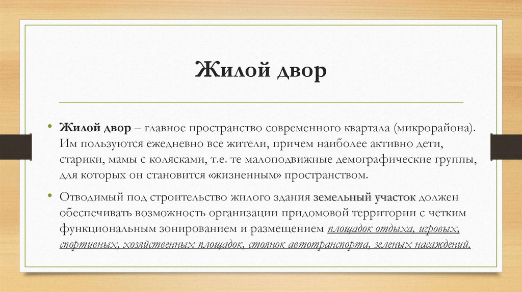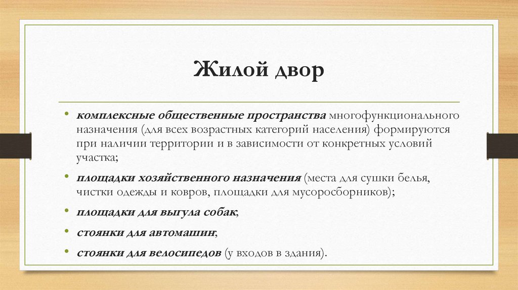 Жилой двор• Двор – это динамически развивающаяся часть жилой среды, зависящая от