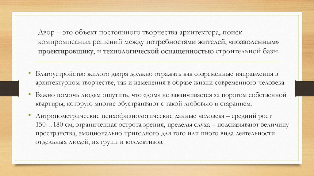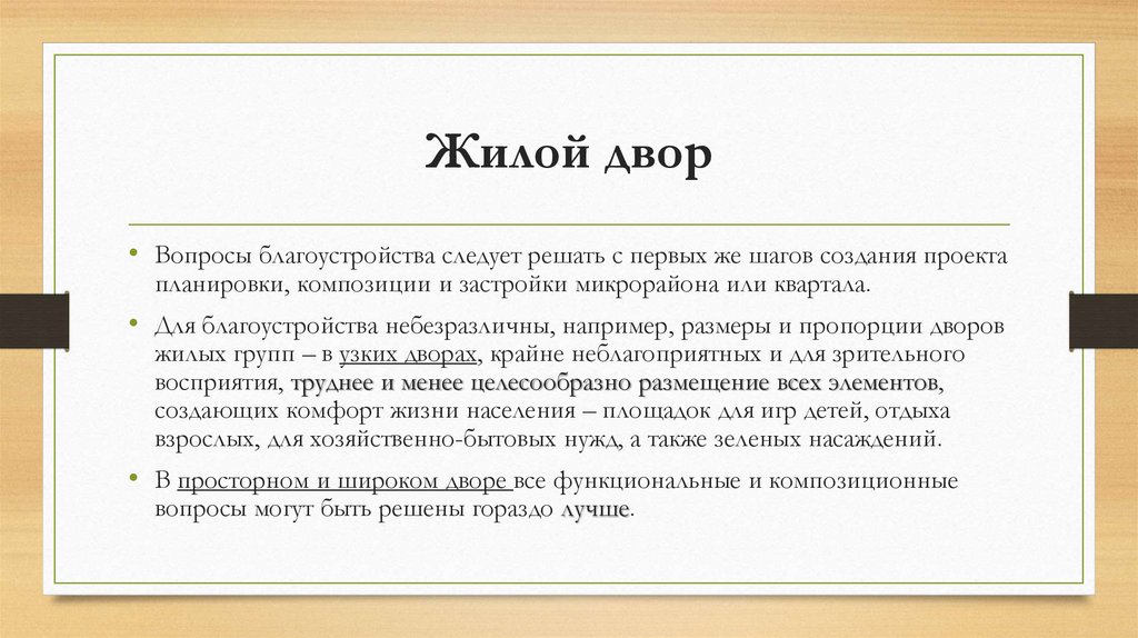 • Для благоустройства небезразличны, например, размеры и пропорции дворов