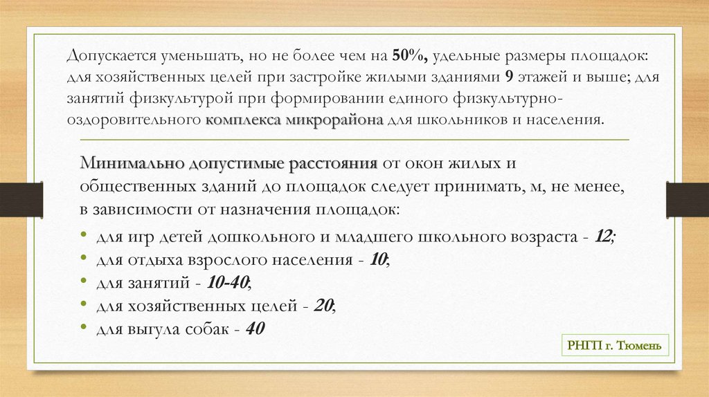 Допускается уменьшать, но не более чем на 50%, удельные размеры площадок:для хозяйственных целей при застройке жилыми зданиями 9 этажей и выше; для