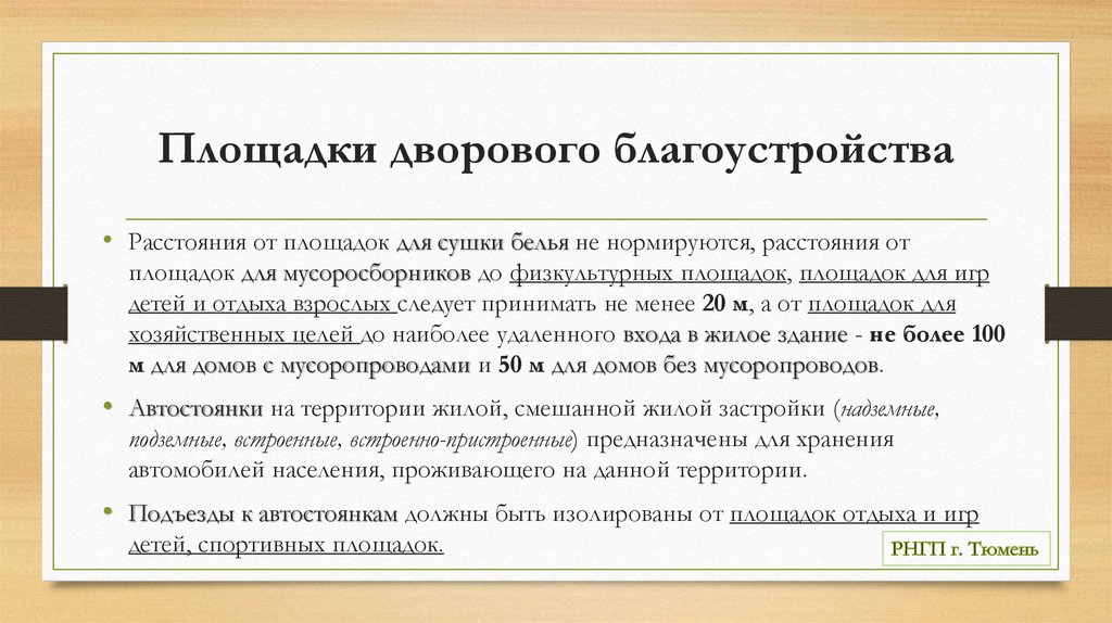 Площадки дворового благоустройства• Расстояния от площадок для сушки белья не нормируются, расстояния от