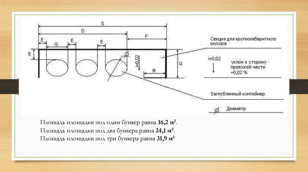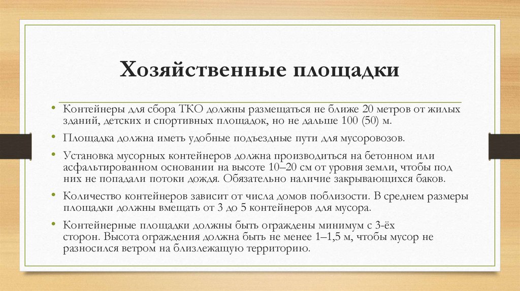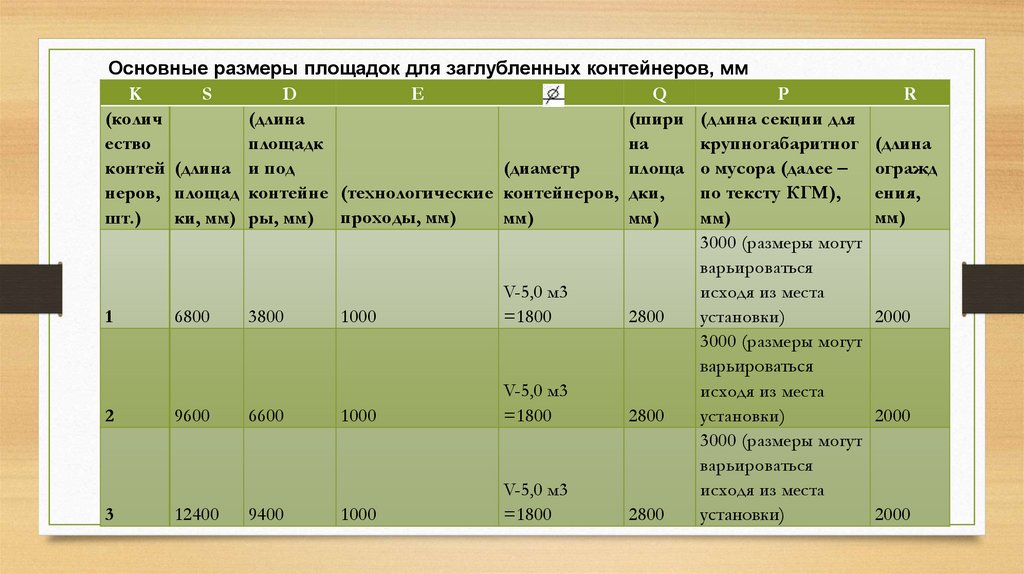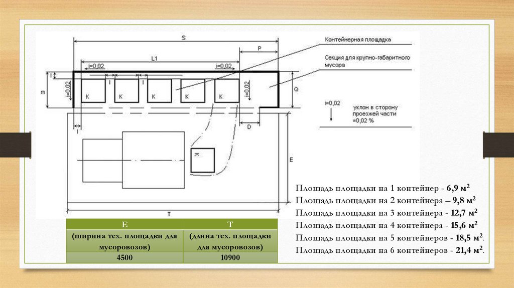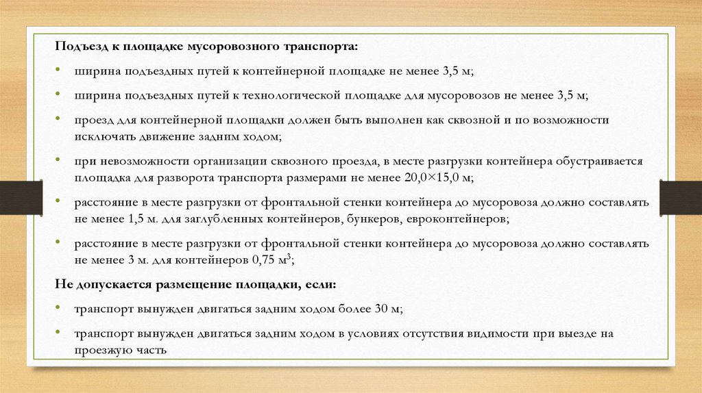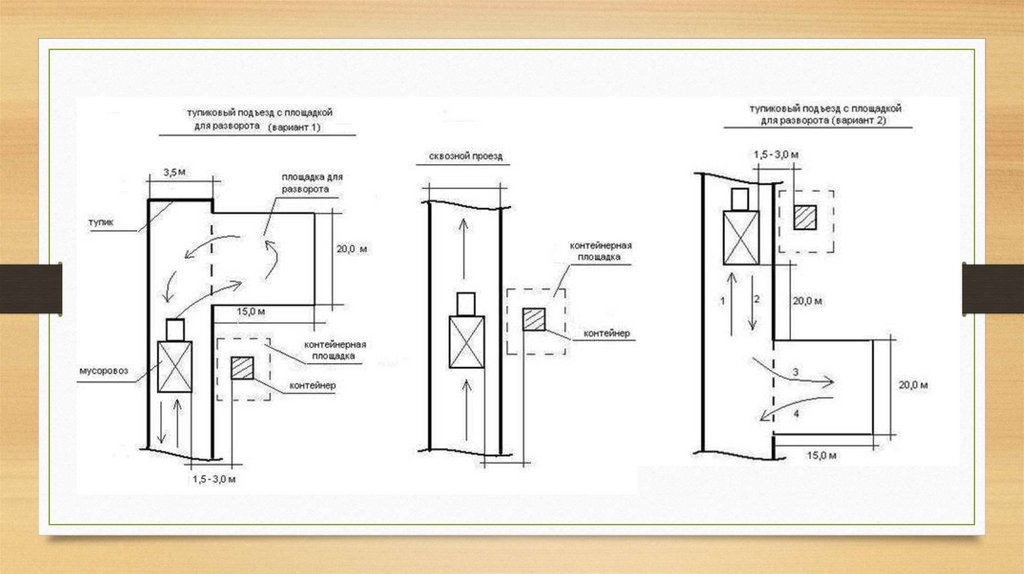 Подъезд к площадке мусоровозного транспорта:• ширина подъездных путей к контейнерной площадке не менее 3,5 м;