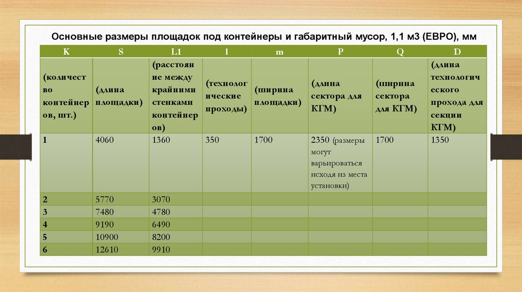 Основные размеры площадок под контейнеры и габаритный мусор, 1,1 м3 (ЕВРО), ммK