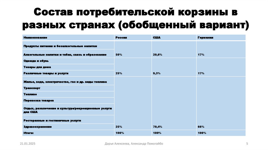 Состав потребительской корзины вразных странах (обобщенный вариант)