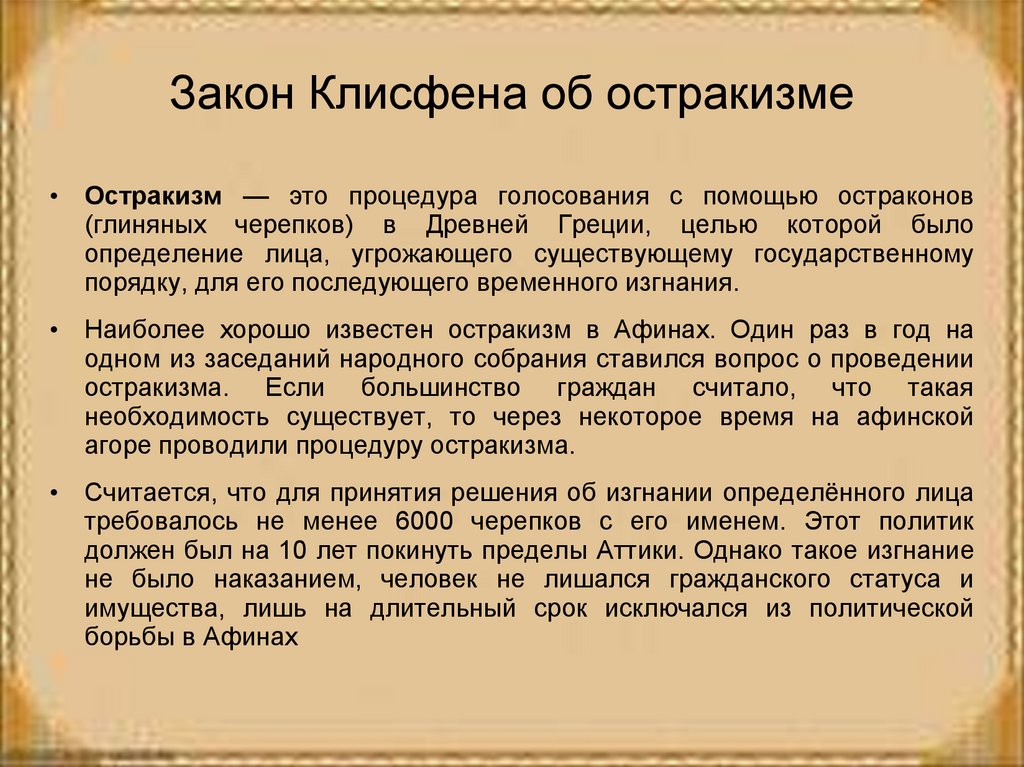 Закон Клисфена об остракизме• Остракизм — это процедура голосования с помощью остраконов