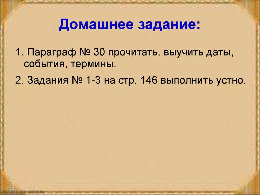 Домашнее задание:1. Параграф № 30 прочитать, выучить даты,