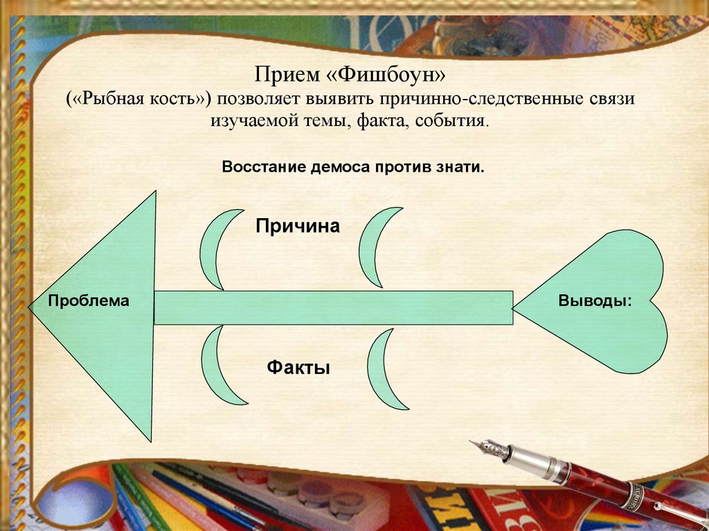 Прием «Фишбоун»(«Рыбная кость») позволяет выявить причинно-следственные связи