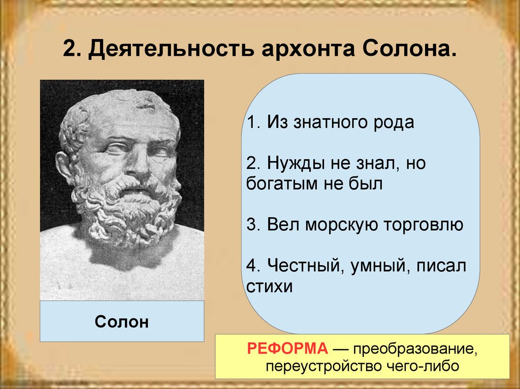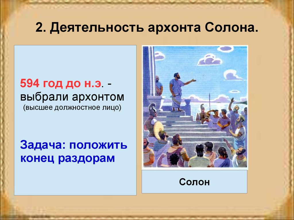 2. Деятельность архонта Солона.594 год до н.э. выбрали архонтом