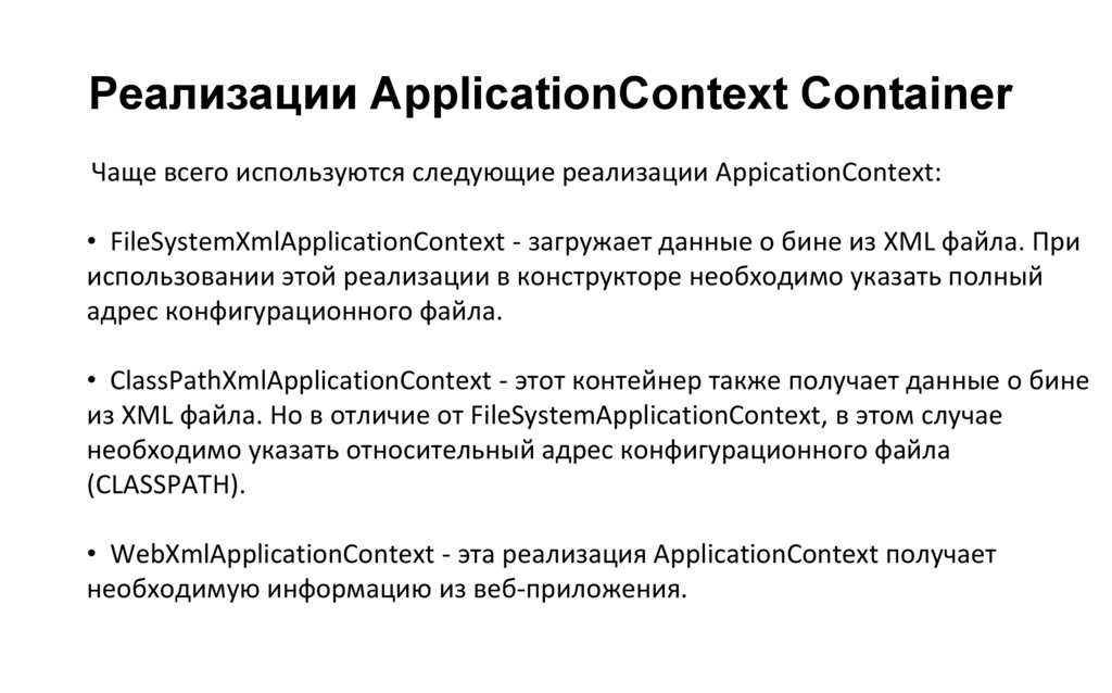 • ClassPathXmlApplicationContext - этот контейнер также получает данные о бине