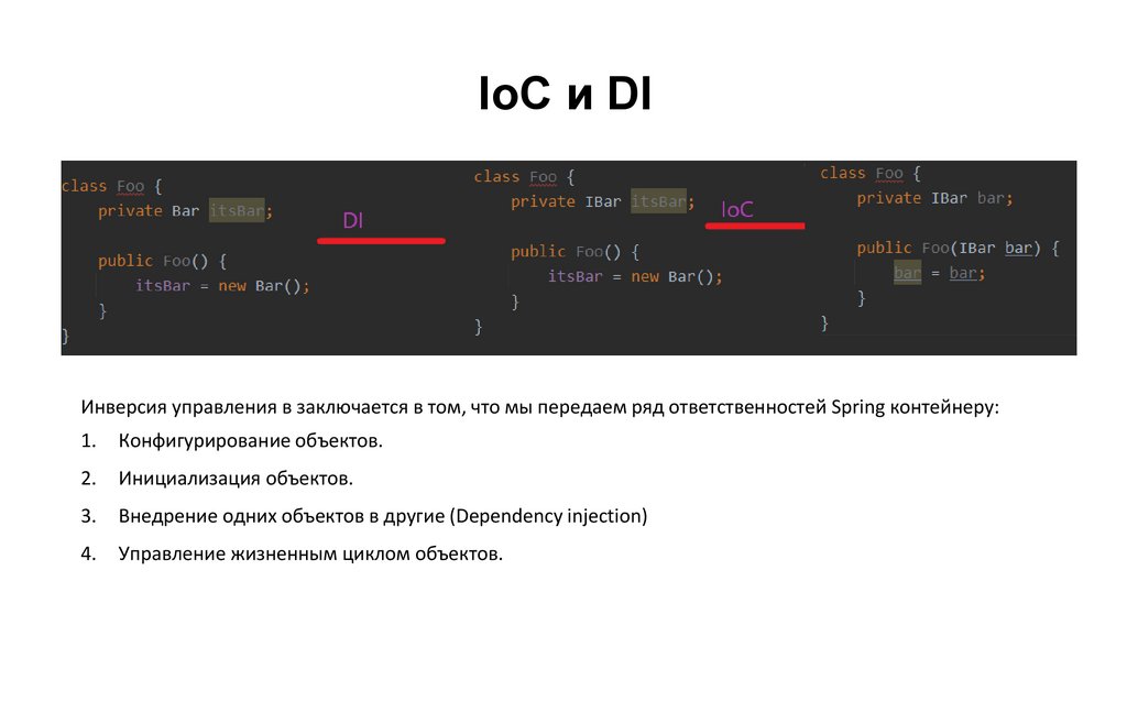 IoC и DIИнверсия управления в заключается в том, что мы передаем ряд ответственностей Spring контейнеру: