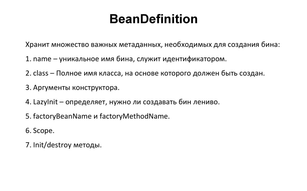 BeanDefinitionХранит множество важных метаданных, необходимых для создания бина: