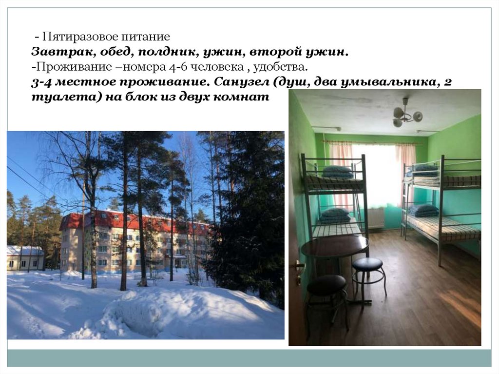 - Пятиразовое питаниеЗавтрак, обед, полдник, ужин, второй ужин.