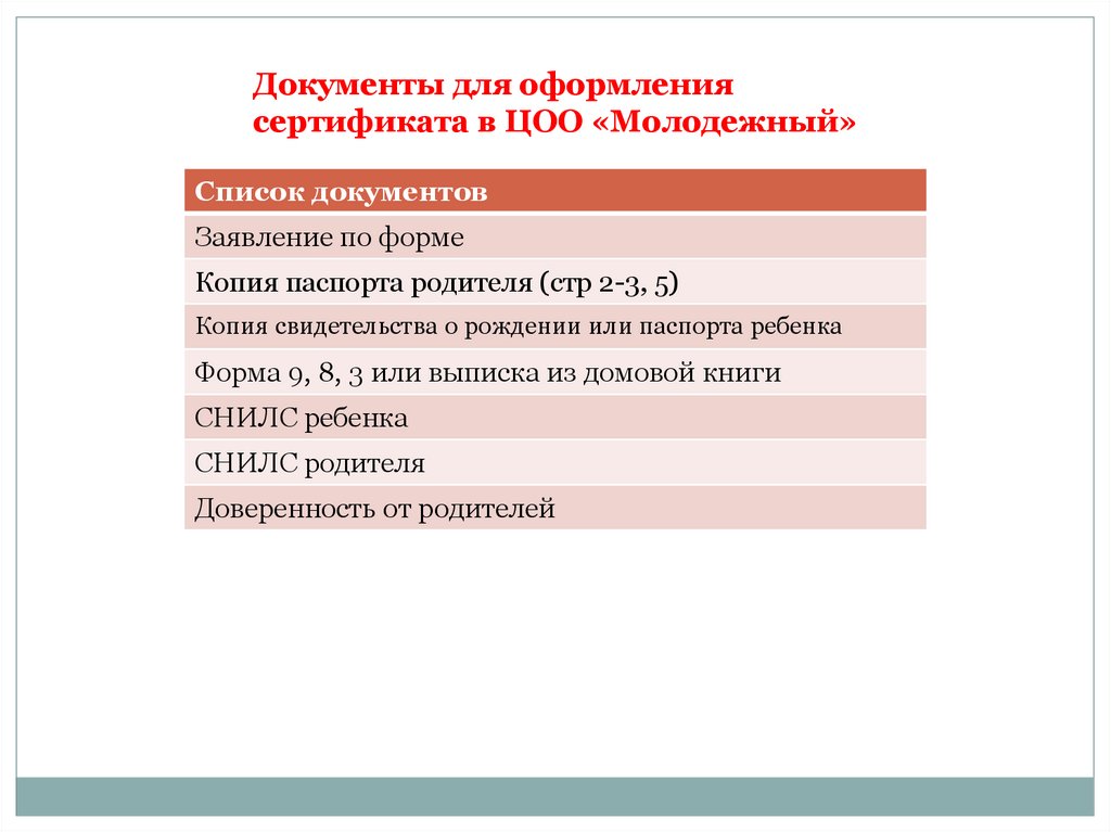 Документы для оформлениясертификата в ЦОО «Молодежный»