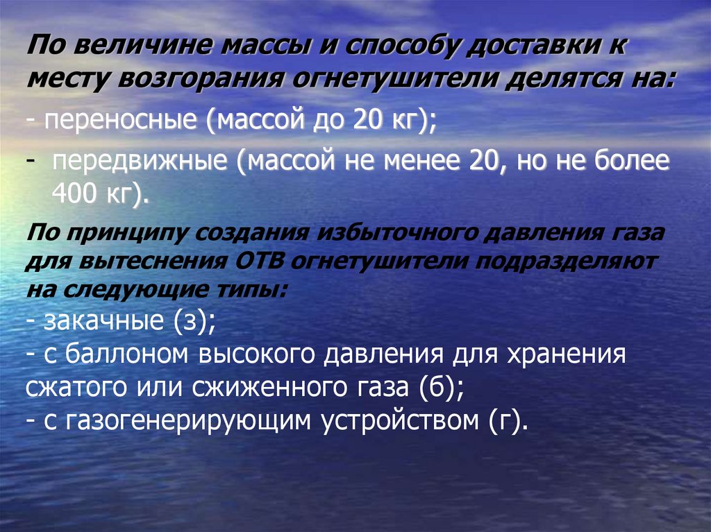 По величине массы и способу доставки кместу возгорания огнетушители делятся на: